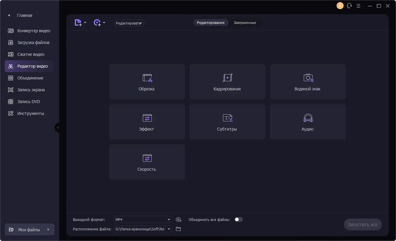- Редактирование видео: обрезка, объединение, изменение соотношения сторон, добавление водяных знаков, субтитров и эффектов