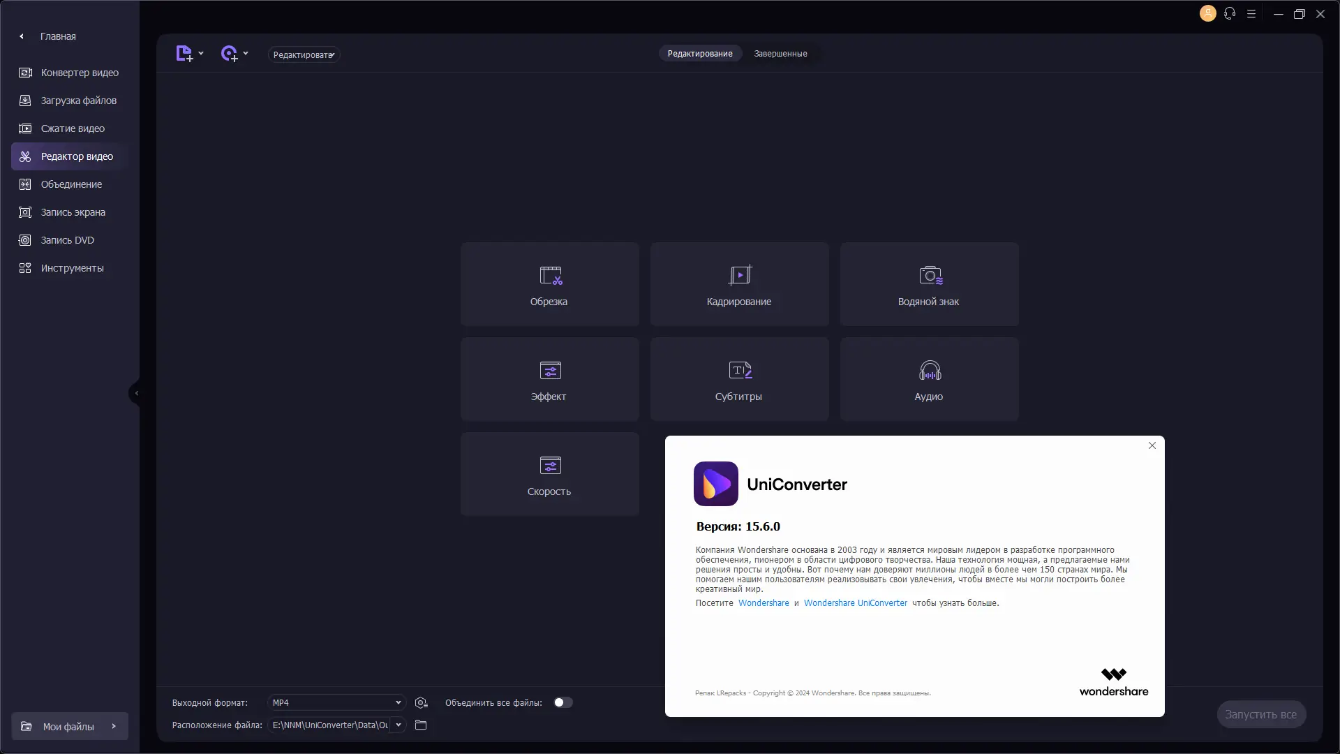 Wondershare UniConverter — универсальный видеоконвертер с простым и удобным интерфейсом, который позволяет легко конвертировать, редактировать, скачивать и записывать видео в более чем 159 форматах. Обладает высокой скоростью обработки — до 30-кратной, без потери качества, поддерживает работу с видео 4K для достижения наилучшего изображения. В программе реализованы мощные инструменты для редактирования, включая вырезание, объединение, изменение субтитров и водяных знаков, а также автоматическое изменение соотношения сторон. Благодаря поддержке конвертации из 2D в 3D и аппаратному ускорению, она подходит для создания домашнего кинотеатра и быстрого преобразования больших видеоматериалов. Возможна передача файлов по Wi-Fi без использования USB-кабеля, что существенно повышает комфорт работы. Также программа позволяет скачивать видео с популярных сайтов, например YouTube, одним щелчком и создавать DVD-диски профессионального уровня с шаблонами меню, что делает её незаменимым инструментом для любителей и профессионалов видеомонтажа.