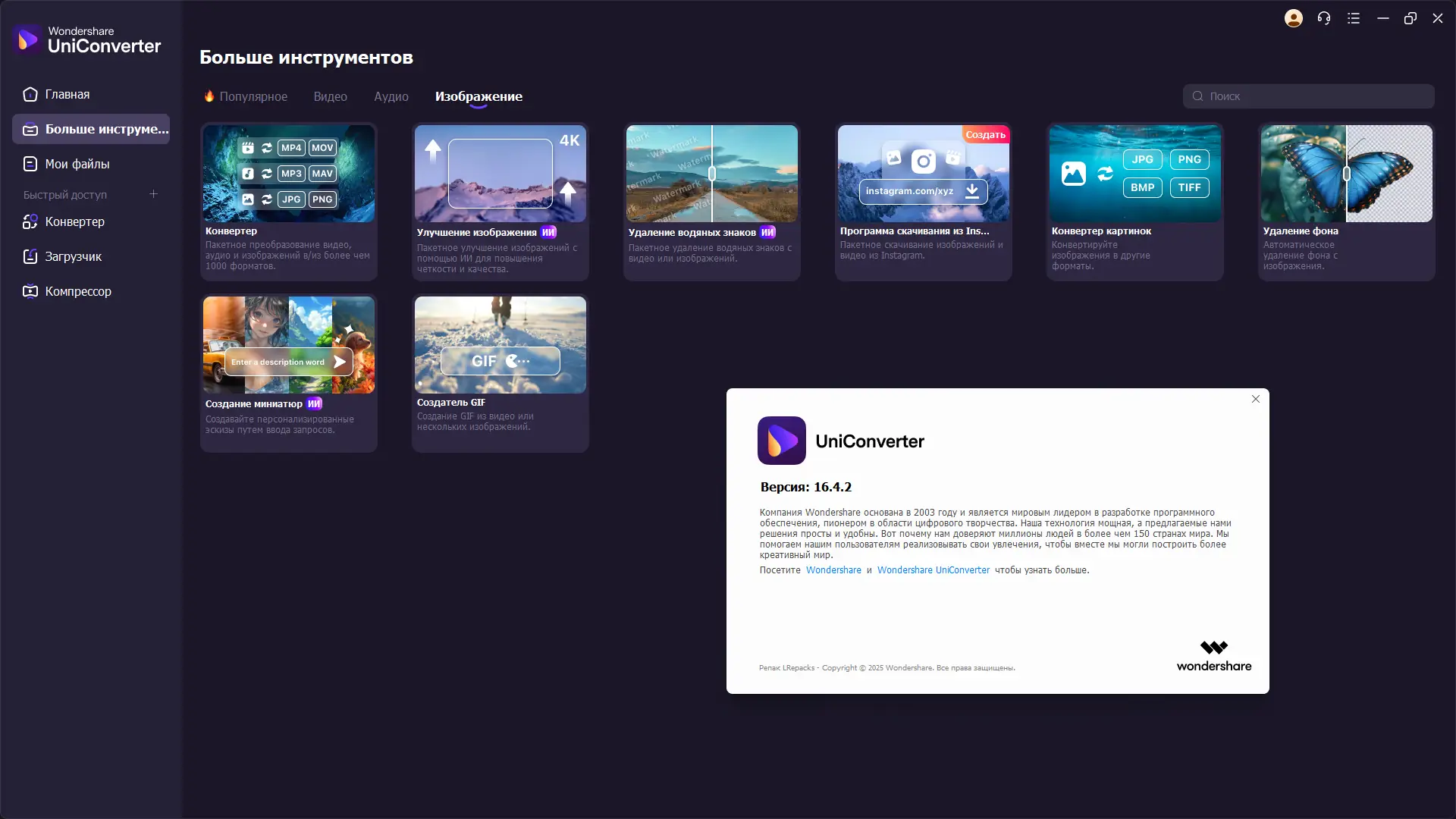 - Дополнительные инструменты: создание GIF, исправление метаданных, работа с изображениями, VR конвертер и многое другое.