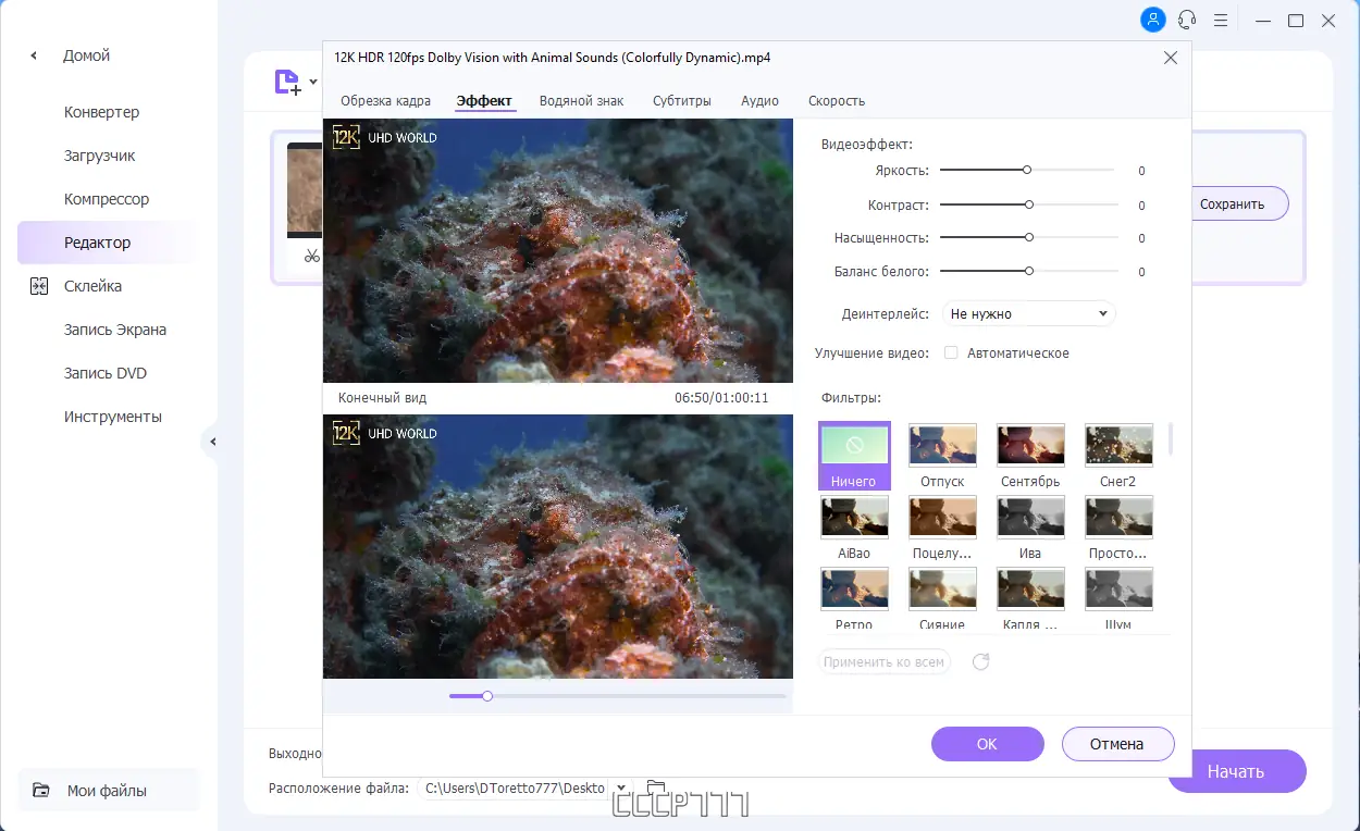 - Редактирование видео: обрезка, объединение, добавление водяных знаков, изменение соотношения сторон и настройка яркости, контрастности и насыщенности