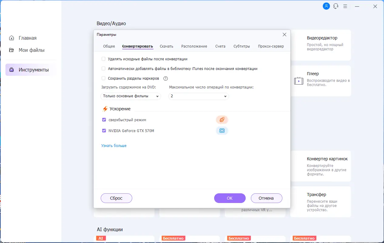 - Конвертация видео и аудио в более чем 159 форматов с высокой скоростью и качеством;