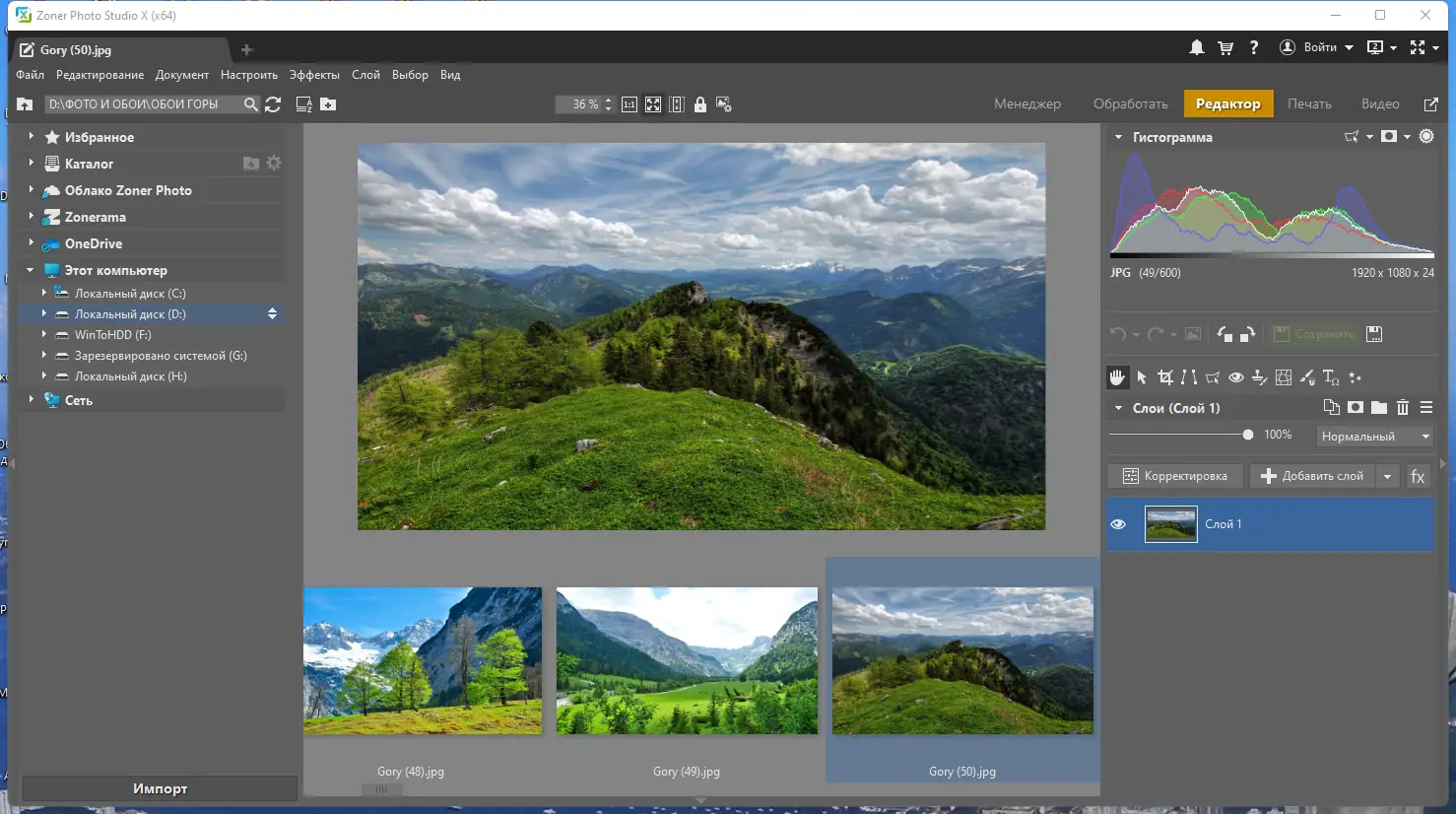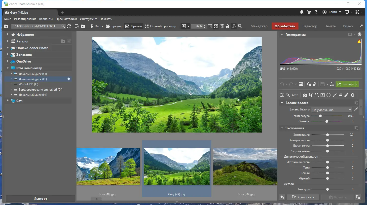 - Редактирование и обработка фотографий с расширенным набором инструментов, включая коррекцию экспозиции, цветокоррекцию, удаление шумов и исправление искажений