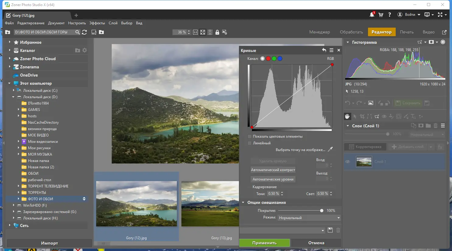 - Редактирование изображений с помощью уровней, кривых, коррекции цветов и устранения дефектов, таких как эффект «красных глаз» и шум.