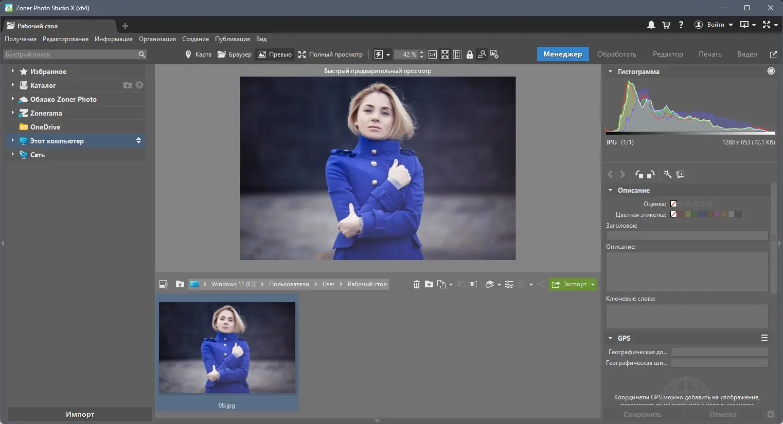 Zoner Photo Studio — это мощное приложение, предназначенное для качественной обработки цифровых снимков. Оно поддерживает работу с различными моделями камер и предусматривает функции извлечения географической информации из фотографий, а также интеграцию с картографическими системами. Программа позволяет редактировать изображения, добавлять текстовые описания, создавать каталоги на различных носителях, а также формировать календари, онлайн фотогалереи и многое другое. Обладает интуитивным интерфейсом и широким набором инструментов, что делает её востребованной как среди любителей, так и среди профессионалов.