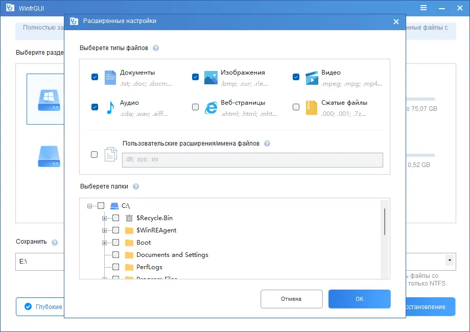 Инструмент включает два вида сканирования: быстрое, предназначенное для поиска недавно удалённых данных, и глубокое, позволяющее восстанавливать файлы после форматирования или повреждения файловой системы. Перед началом поиска пользователь может задать параметры поиска, выбрать типы файлов и папки для сохранения результатов, что повышает точность и удобство работы.