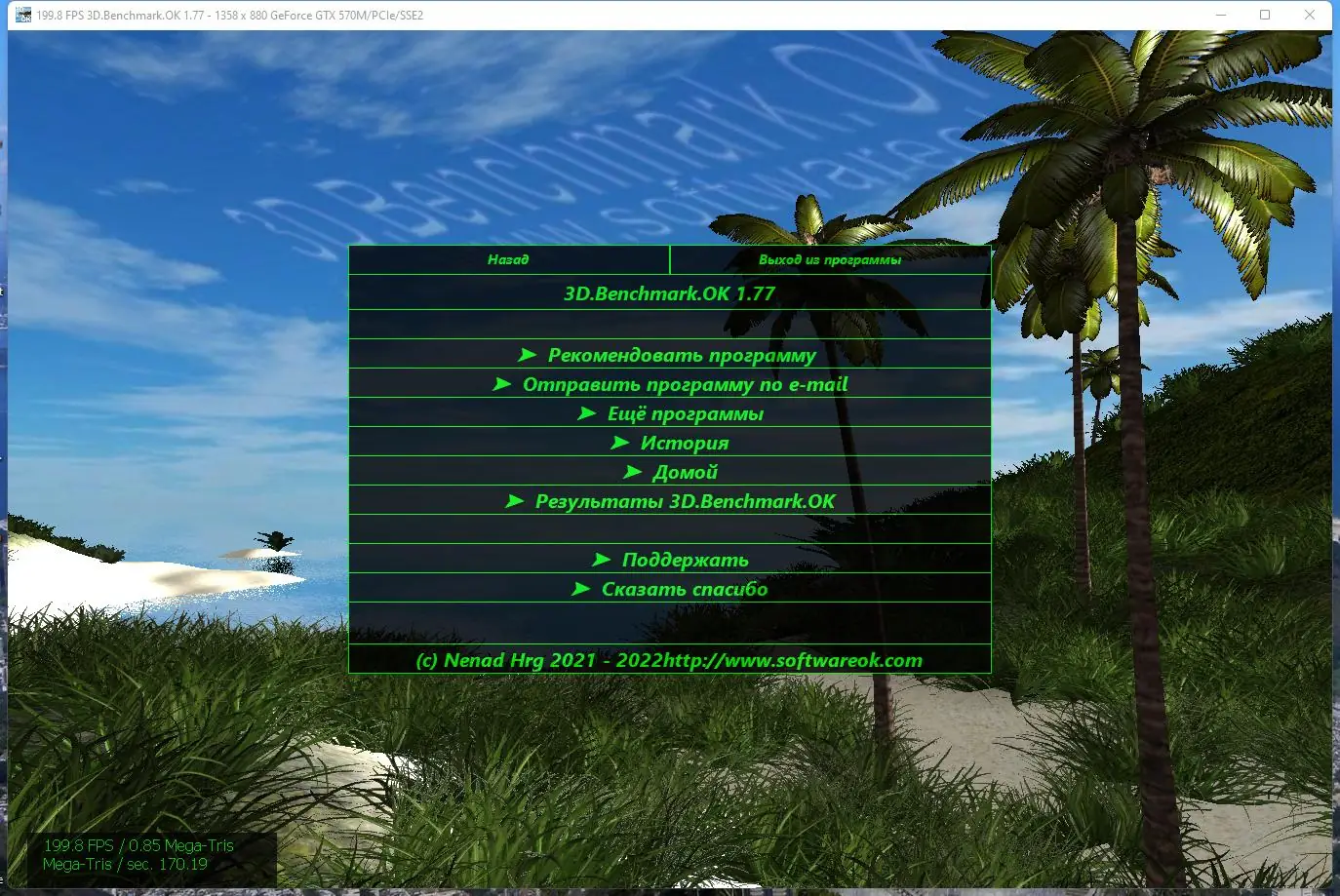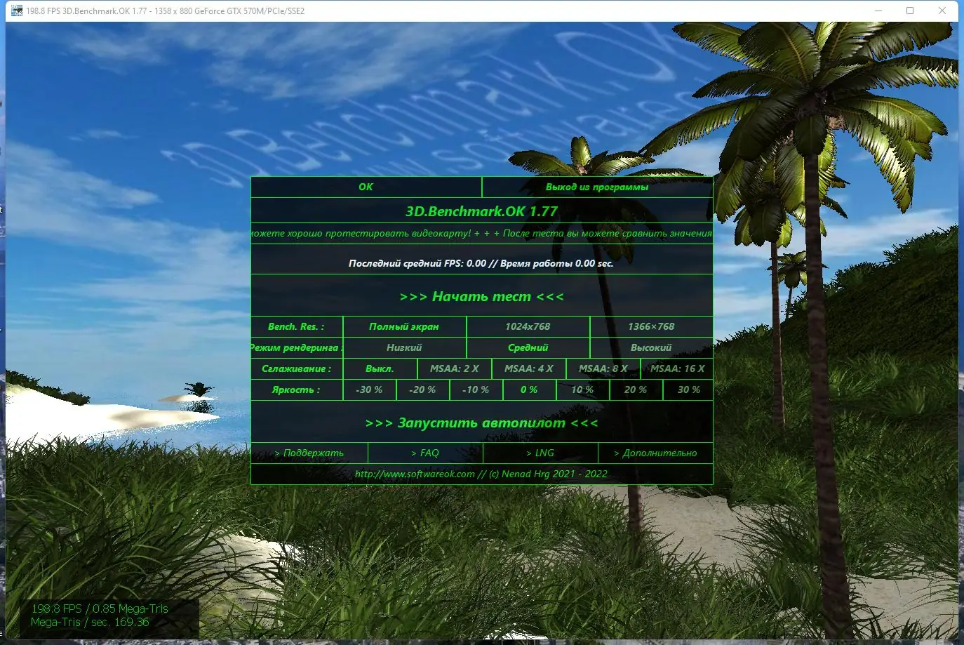 3D.Benchmark.OK — это мощное, но при этом легкое решение для проведения автоматического тестирования возможностей вашей видеокарты за всего 65 секунд. Программа позволяет не только быстро проверить производительность, но и удобно настроить уровни бенчмарка, а также наблюдать за реалистичными сценами со сглаживанием и эффектами, такими как вода, преломление света, отражение и ветер. Благодаря поддержке портативных версий, запуск не требует инсталляции и подходит для использования на различных системах.