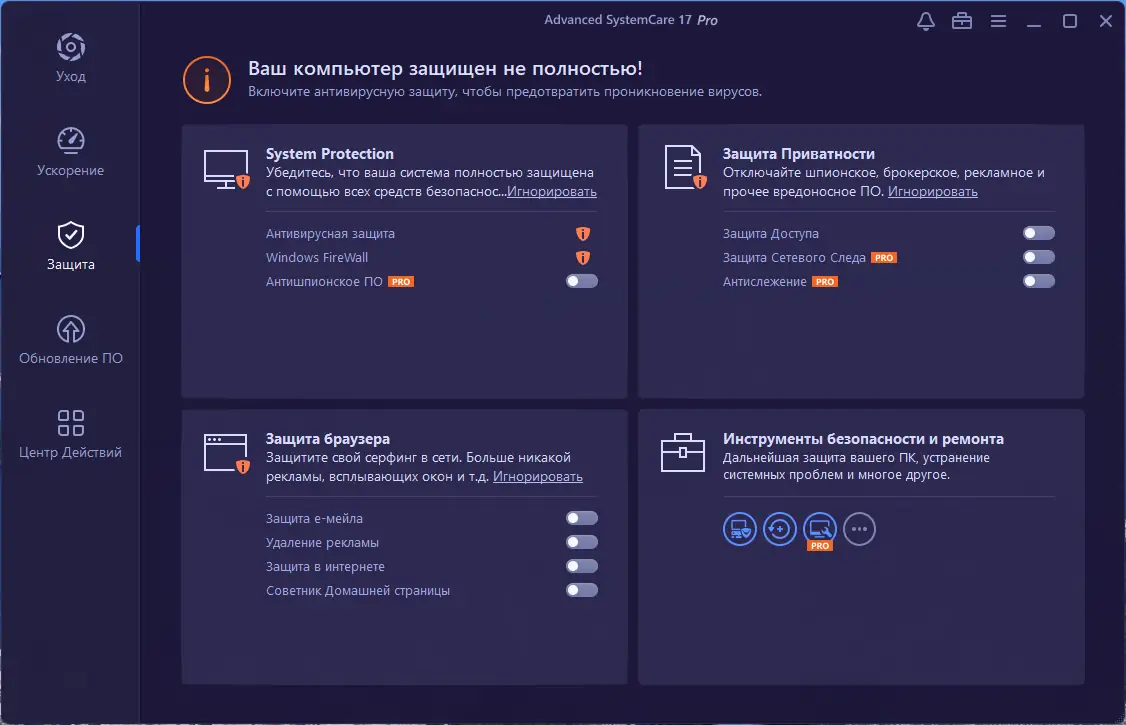 Advanced SystemCare PRO — это профессиональный пакет для автоматической и ручной настройки операционной системы Windows. Включает множество модулей для очистки, оптимизации и повышения производительности вашего ПК. Программа позволяет настроить Windows до уровня максимальной эффективности, ускорить интернет-соединение до 300 процентов и защитить систему от вирусных угроз, шпионского и рекламного ПО. Она помогает исправлять ошибки в системном реестре, очищать ненужные файлы, управлять автозагрузками, а также обеспечивает глубокую очистку и дефрагментацию дисков. Русский интерфейс и запуск с правами администратора делают использование программы максимально удобным. Внимание! Программа полностью русифицирована и требует запуска от имени администратора, при этом язык интерфейса рекомендуется оставить неизменным.