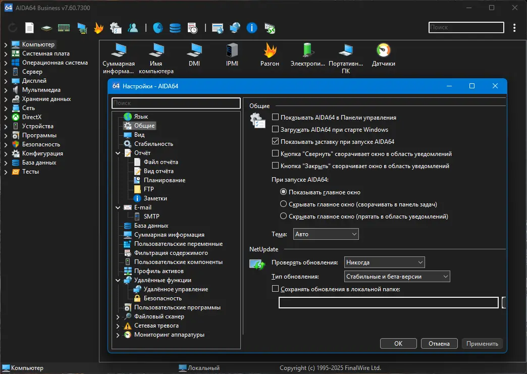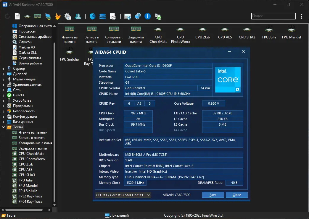 - Функции тестирования стабильности системы и производительности CPU, FPU, памяти и дисков;