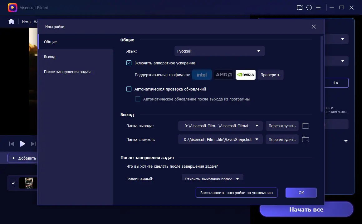 - Запустите приложение и настройте параметры в соответствии с типом контента и требуемым результатом.