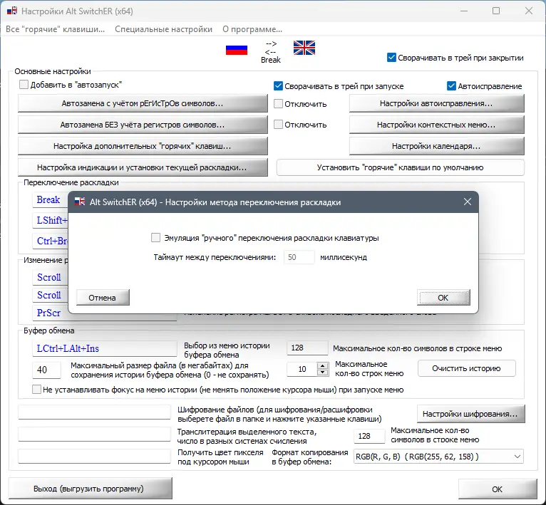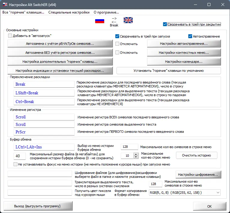 - Настройка форматов копирования цвета RGB, вывод иконки цвета в меню, а также назначение двойных нажатий горячих клавиш, например, для вставки символов по двойному клику.