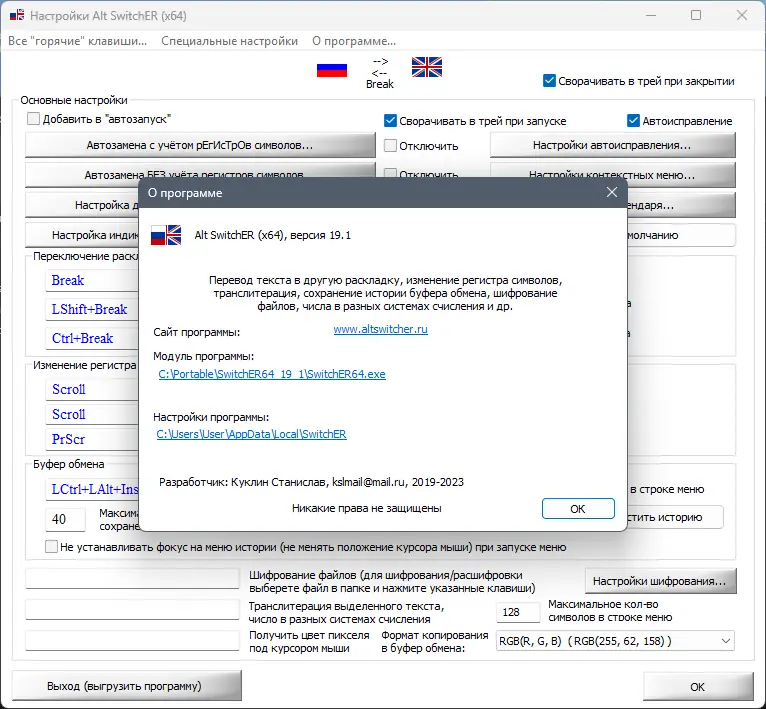 Alt SwitchER — это бесплатная портативная утилита для автоматического исправления раскладки клавиатуры и расширенных настроек ввода в системе Windows. Программа не требует установки, работает в любых версиях Windows 7, 8/8.1, 10 и 11, поддерживая x32 и x64 Bit. В отличие от популярных аналогов, таких как Punto switcher и Caramba Switcher, Alt SwitchER не ведет логов, не обновляется автоматически и не взаимодействует с сетью, что обеспечивает высокий уровень конфиденциальности и стабильности работы.