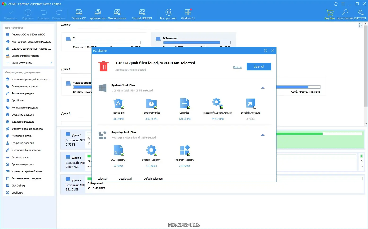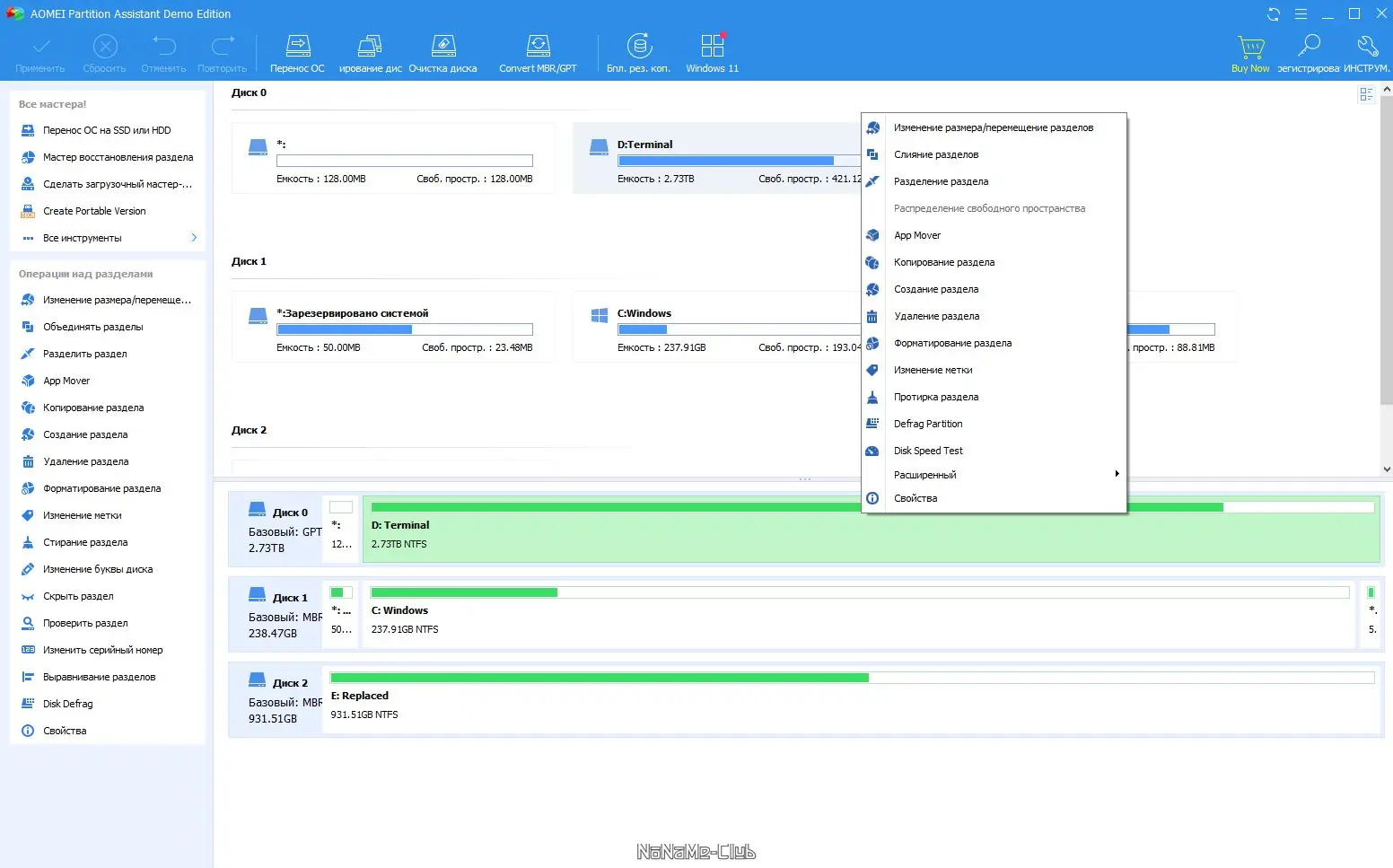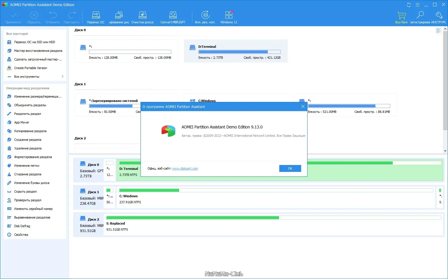 «AOMEI Partition Assistant Standard Edition» — это бесплатный многофункциональный инструмент для администрирования разделов жестких дисков. Удобное решение, позволяющее выполнять основные операции с разделами, такие как изменение, перемещение, объединение, разделение, создание, удаление, форматирование и скрытие разделов. Программа обеспечивает изменение размера раздела без потери данных с помощью простого графического интерфейса, реализованного в виде перетаскивания мышкой.