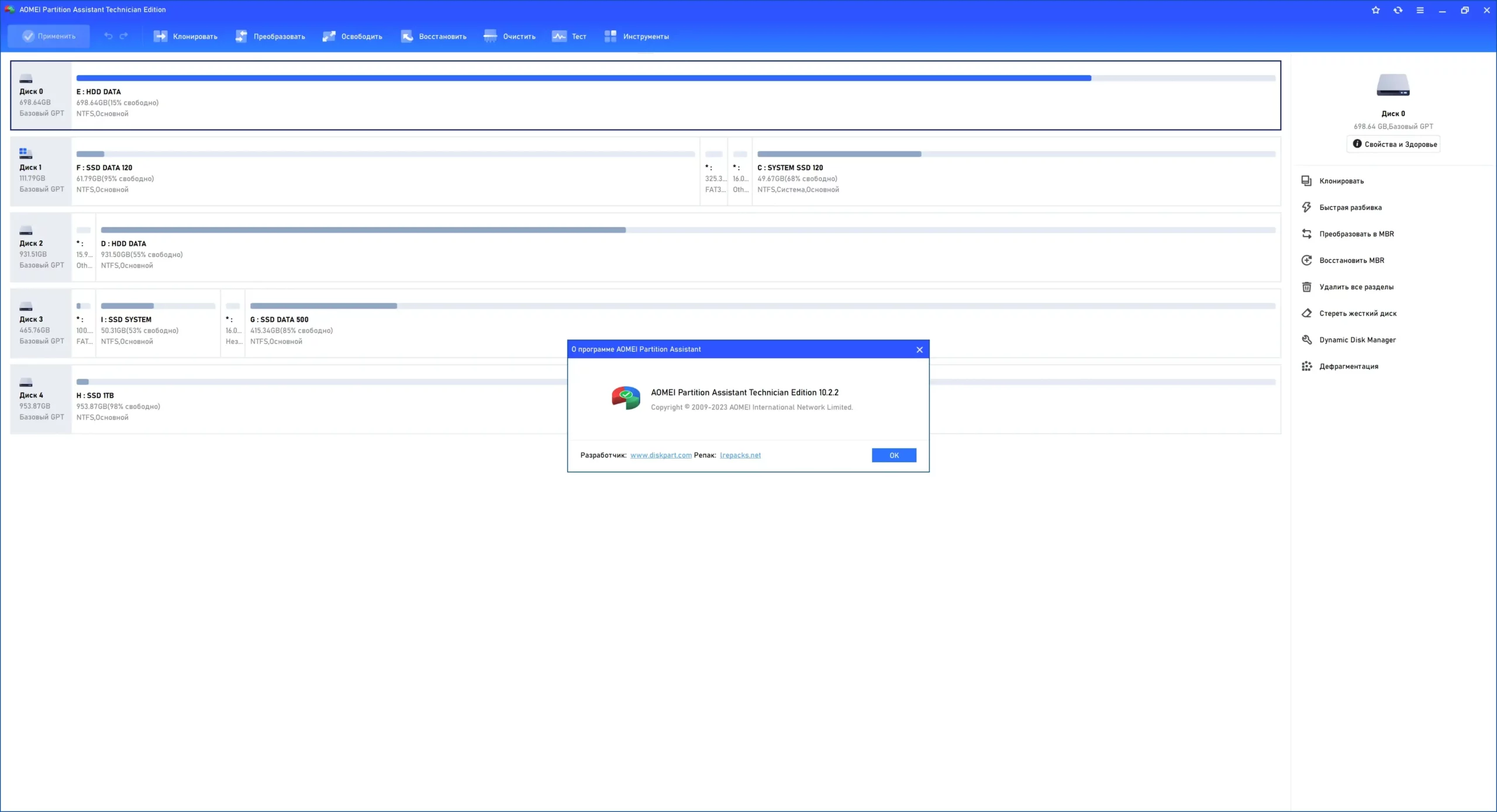 Программа AOMEI Partition Assistant — это мощный инструмент для эффективного управления жёсткими дисками и разделами. Она предназначена для администраторов и пользователей ПК, желающих легко изменять размеры разделов, объединять, разделять, клонировать и восстанавливать их без потери данных. Встроенная поддержка управления динамическими томами и конвертации между GPT и MBR расширяет возможности работы с различными конфигурациями дисков и ОС. Благодаря интуитивному интерфейсу, инструмент подходит для как профессиональной, так и домашней эксплуатации, позволяя оптимизировать работу системы и максимально использовать доступное пространство.