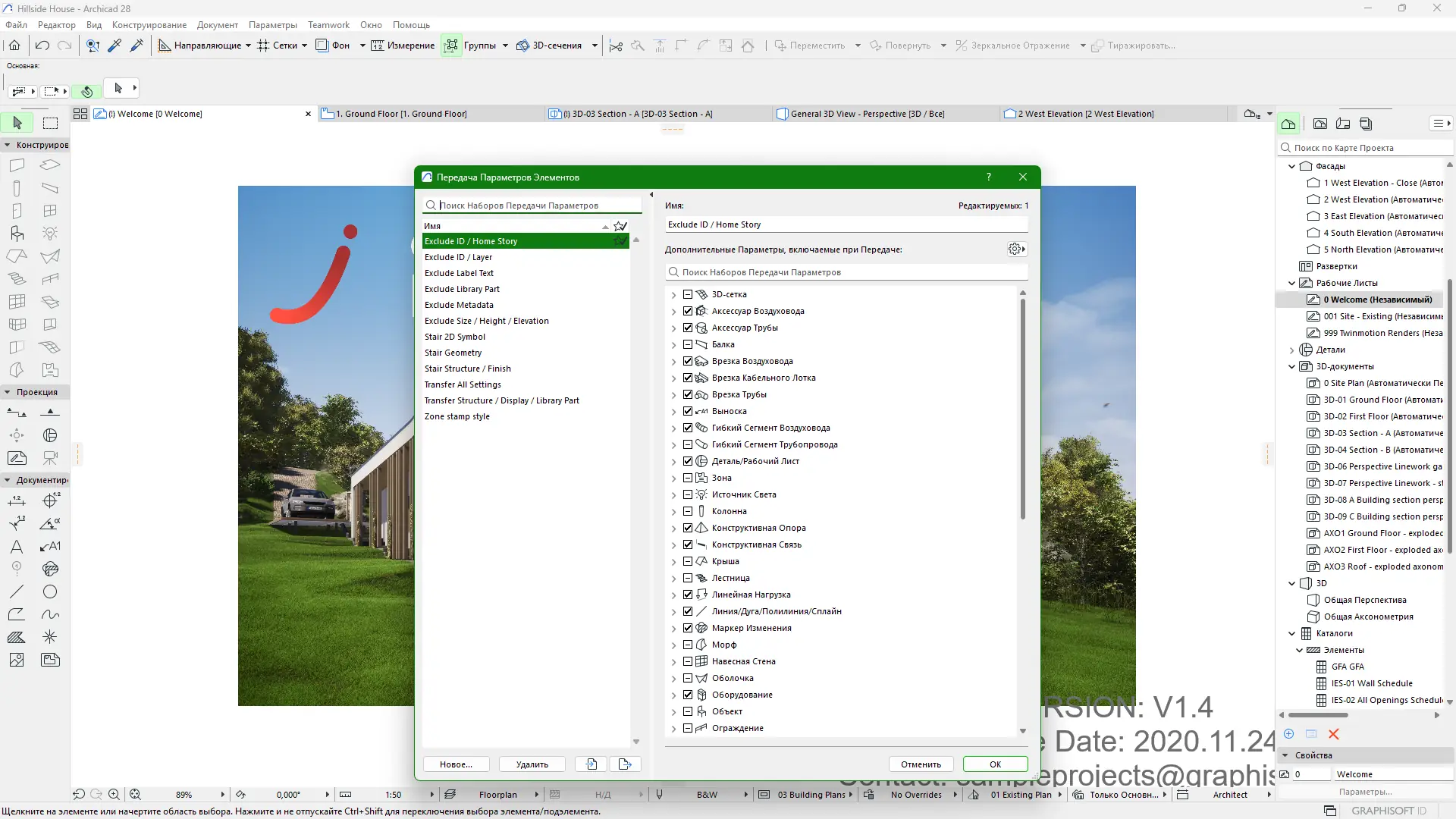 - Передача параметров элементов с возможностью отключения передачи специфичных параметров, например, смещения от собственного этажа для перекрытий и крыш, что повышает точность моделирования.