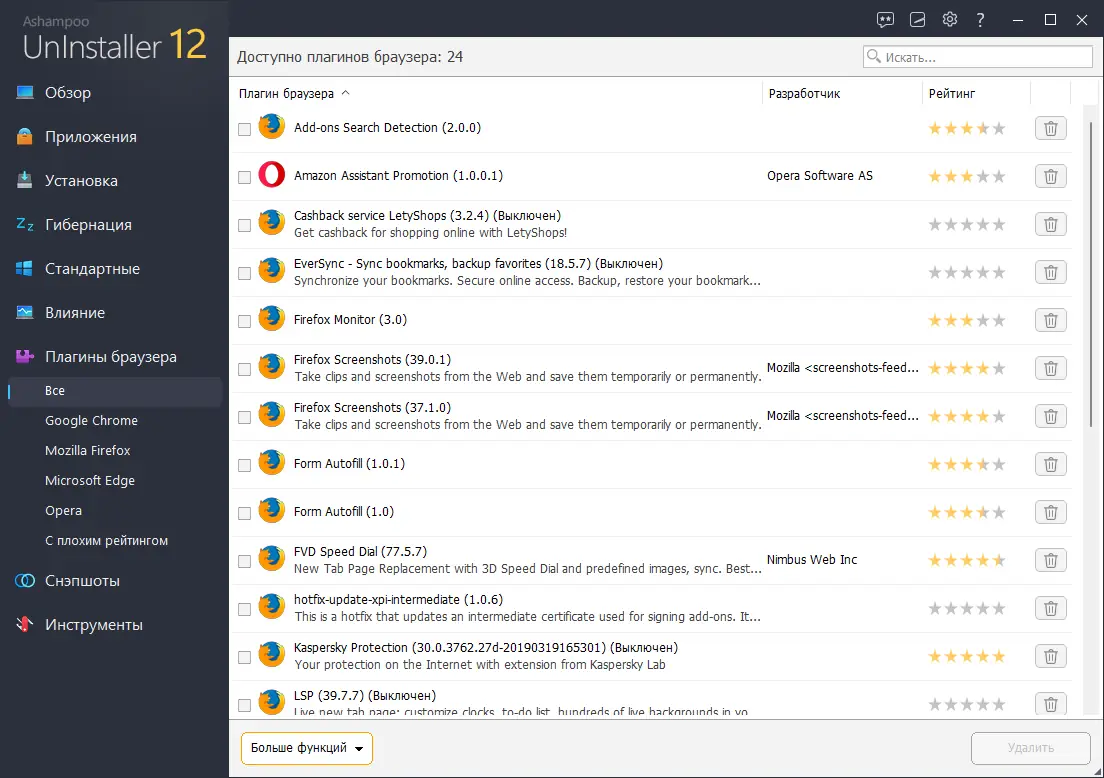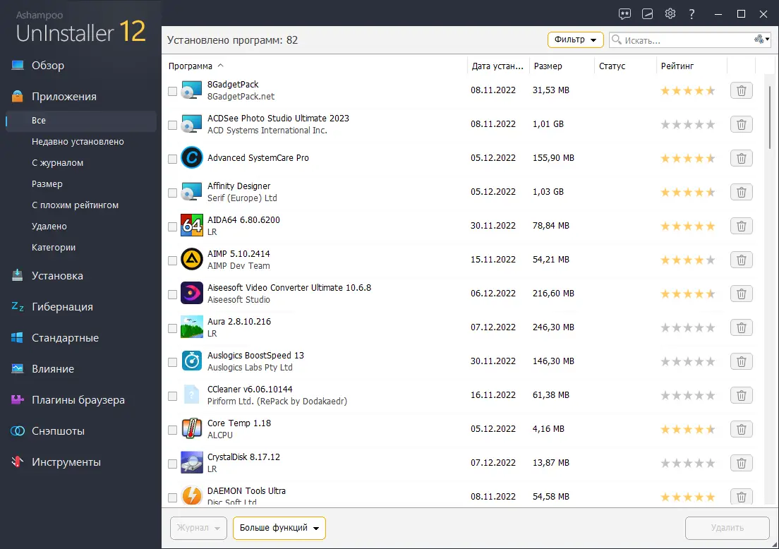Мощный инструмент для управления программами, Ashampoo® UnInstaller 12 помогает устранять ненужное ПО, расширения браузеров и панели инструментов одним кликом. Он тщательно контролирует каждую установку, позволяет полностью удалить даже проконтролированные вручную программы, а также показывает влияние приложений на производительность системы. Новая технология снэпшотов фиксирует все изменения файлов и реестра в режиме реального времени, обеспечивая безопасное удаление и чистоту системы. Кроме того, программа вводит режим «гибернации» — переводит связанные элементы автозапуска и служб в спящий режим, освобождая ресурсы без удаления приложений. Это делает работу ПК более быстрой и стабильной.