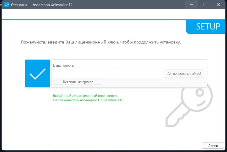 - Для активации по лицензионному ключу введите полученный через сайт Ashampoo UnInstaller 14 код в соответствующую строку.