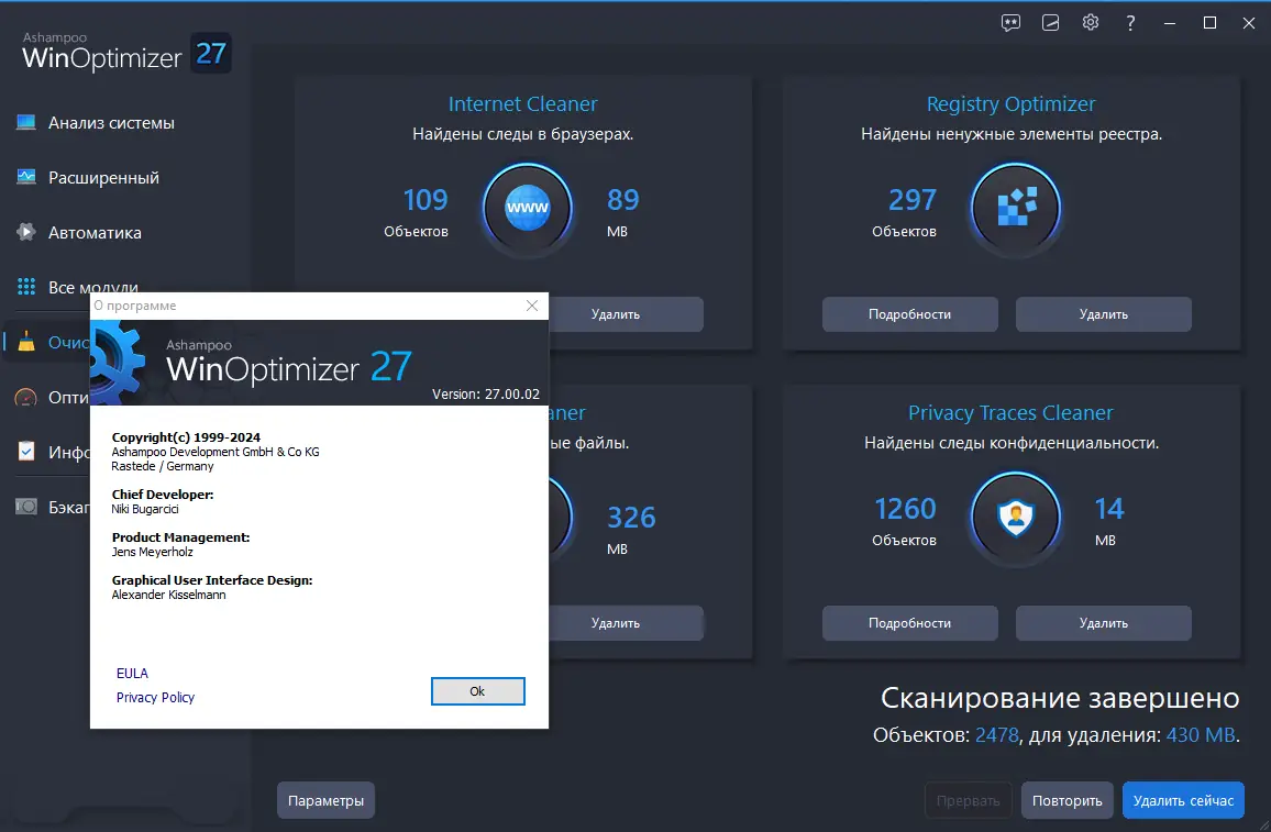 - Тщательная углублённая очистка системных областей, включая реестр, кэш шейдеров и следы работы в Интернете