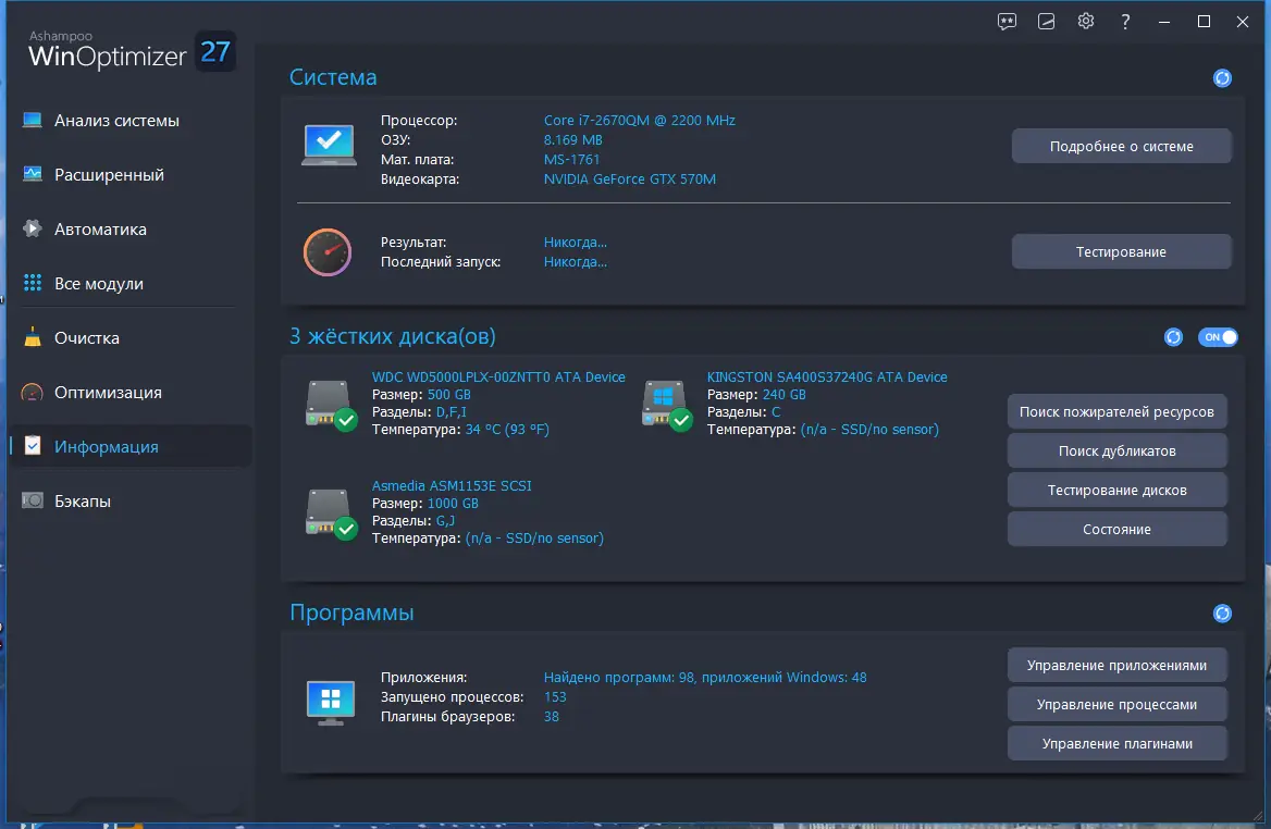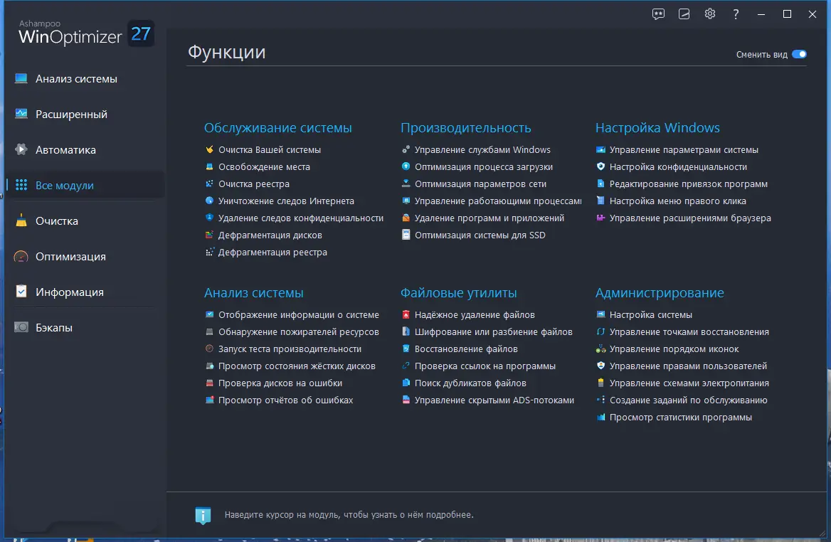 Ashampoo WinOptimizer — современное решение для комплексной настройки и очистки операционной системы Windows. Этот мощный пакет программ включает утилиты для удаления ненужных файлов, очистки системного реестра, защиты личных данных и повышения производительности системы. Благодаря расширенным модулям, пользователь сможет освободить место на диске, ускорить запуск ОС, управлять расширениями браузеров, а также настраивать параметры Windows по своему усмотрению. Новые модули обеспечивают более быструю и эффективную очистку, что позволяет дать ПК с Windows мощный прирост в производительности и безопасности.