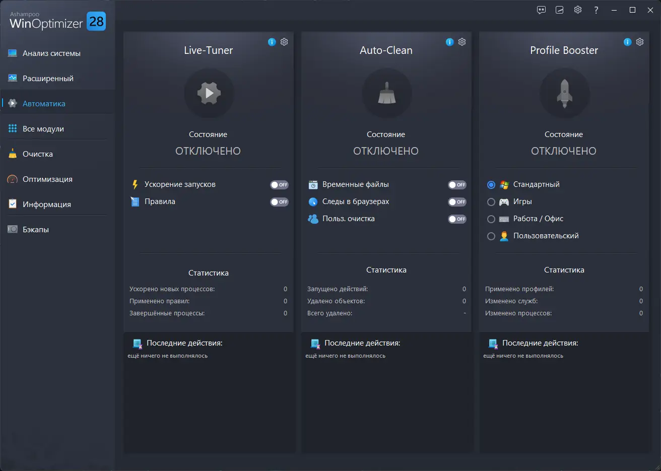 - Автоматизация ускорения работы системы и приложений благодаря профильным профилям и приоритизации процессов.