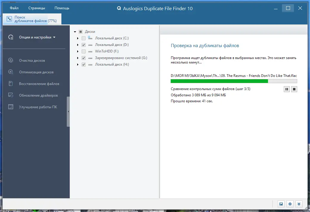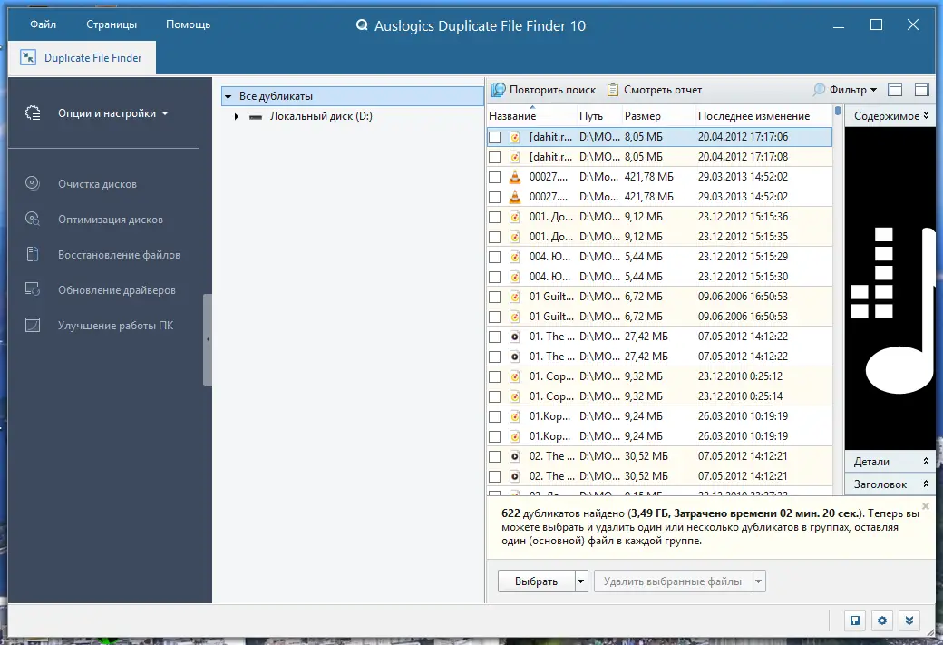 Auslogics Duplicate File Finder поможет Вам избавиться от ненужных дубликатов файлов любого типа, позволяя очистить до 50% дополнительного места на жестком диске. В процессе эксплуатации системы зачастую накапливаются идентичные файлы, что занимает ценное пространство. Эта программа сможет сравнительно быстро обнаружить одинаковые документы, музыку, видео и другие файлы, сравнивая их по содержанию и одинаковым признакам. Благодаря удобному интерфейсу и мощным функциям, Вы сможете систематизировать свои медиа-архивы и значительно снизить время дефрагментации диска.