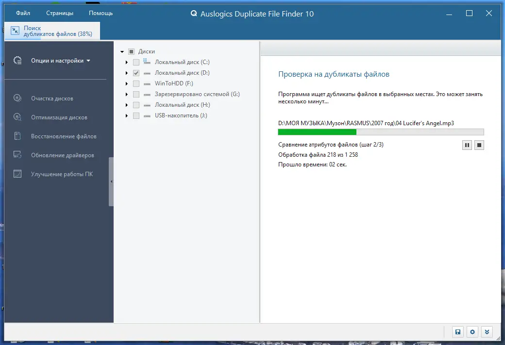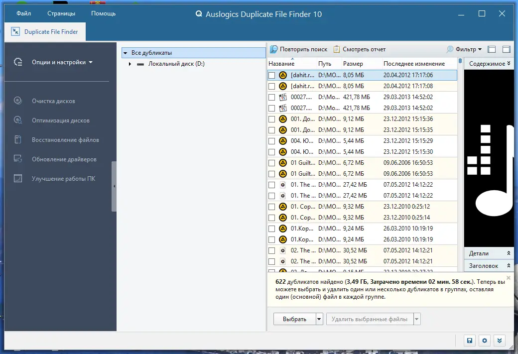 Auslogics Duplicate File Finder поможет Вам избавиться от ненужных дубликатов, освободив до 50% дополнительного пространства на жестком диске. С помощью этой бесплатной программы можно определить и удалить абсолютно одинаковые файлы, которые накапливаются при повседневной работе компьютера. В результате использования, Ваш диск станет организованнее, а свободное пространство — больше. Файлы-дубликаты могут возникать из-за загрузки одинаковых музыкальных, видео и документов, обмена файлами с друзьями или копирования данных. Часто такие копии занимают ценное место и мешают эффективной работе системы.