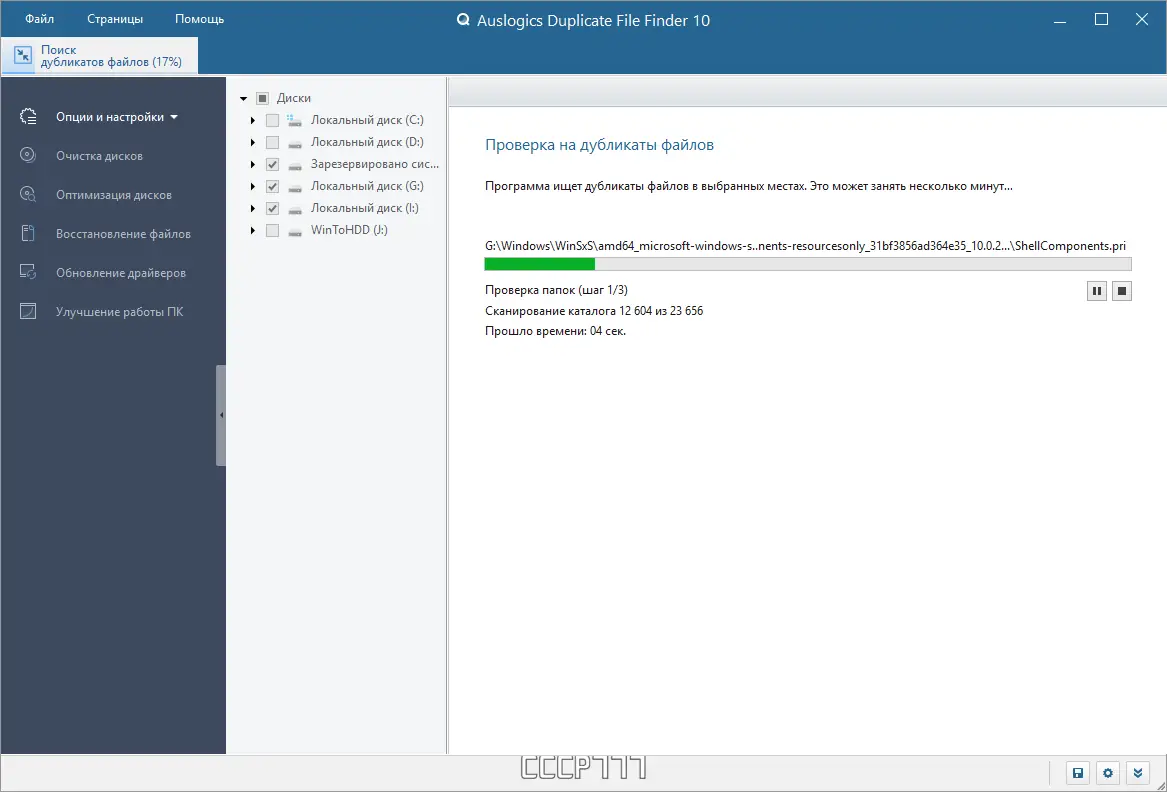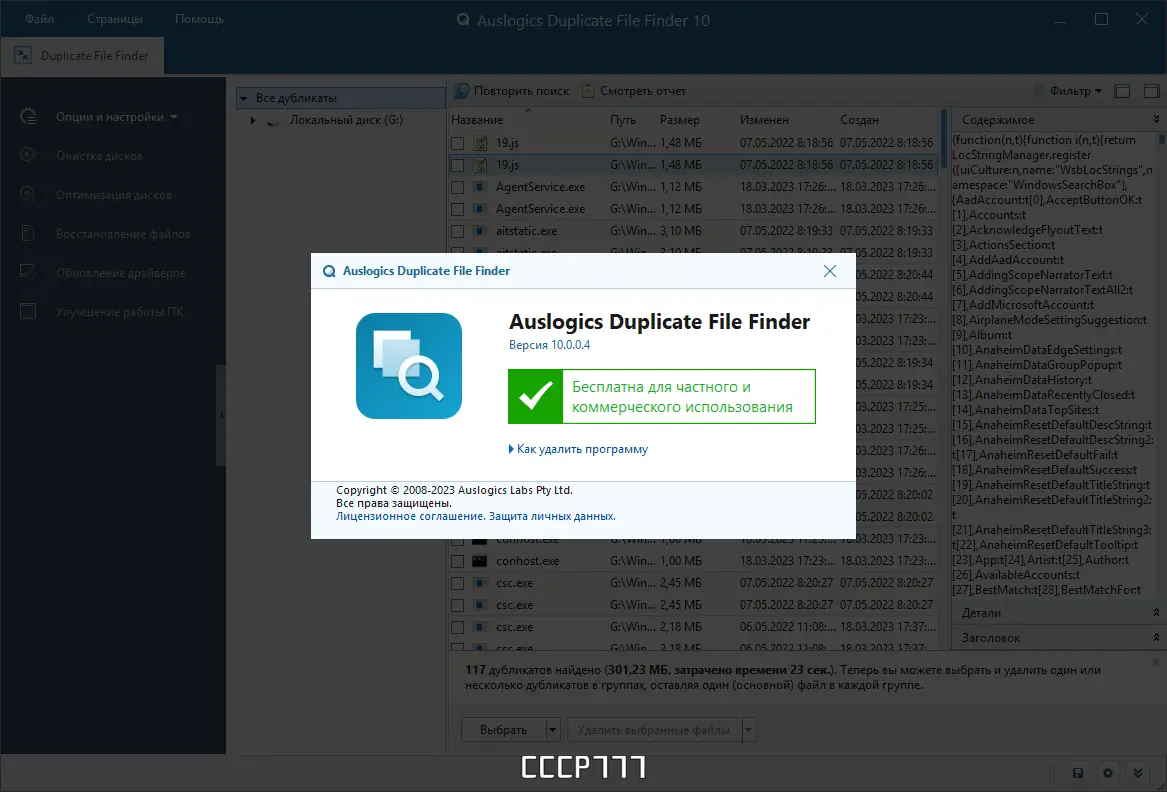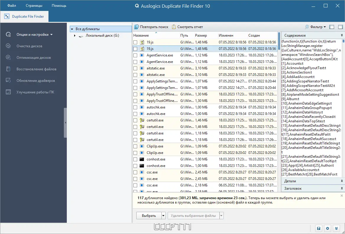 - Обеспечивает очистку диска, устраняя дублирующиеся файлы и освобождая место;