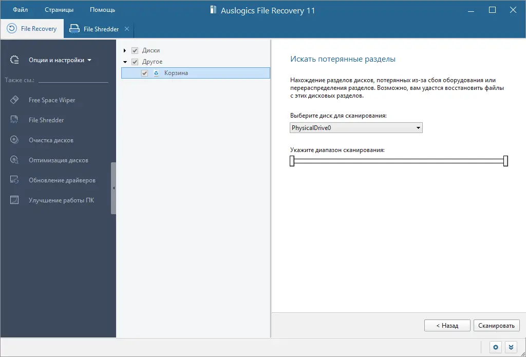 - Восстановление удалённых файлов, в том числе и после очистки корзины или форматирования.
