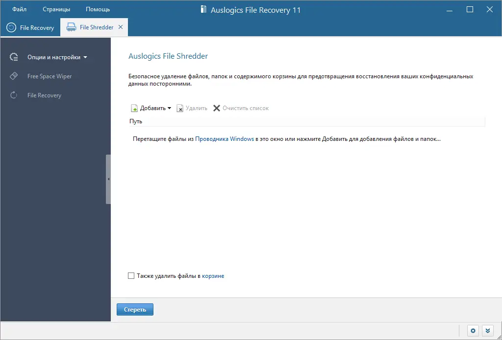 - Функция безопасного удаления, исключающая возможность восстановления удалённых файлов через сторонние программы.