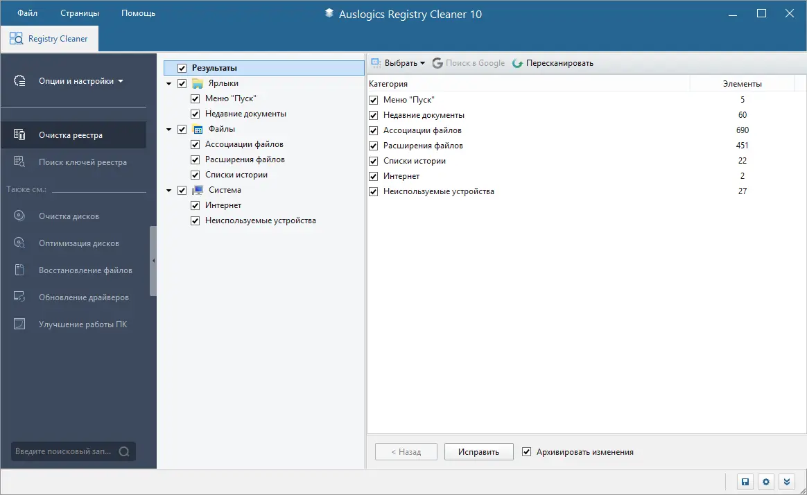 - Исправление ошибок реестра для предотвращения сбоев системы