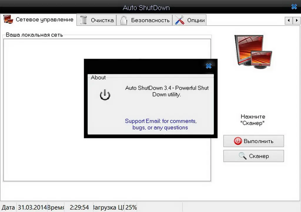 Auto ShutDown предназначена для автоматизации процесса выключения компьютера, что позволяет пользователям оставить устройство в рабочем режиме без необходимости ручного управления. Программа отличается простотой настройки и универсальностью: она может отключать ПК по расписанию, при отсутствии активности пользователя, а также управляться через локальную сеть, что особенно удобно для тех, кто использует несколько устройств. Кроме того, с помощью данной программы можно запланировать перезагрузки или установить напоминания в виде будильников. Возможность отображения оставшегося времени до выключения на мониторе помогает контролировать процесс автоматизации.