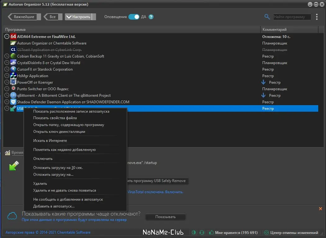 Autorun Organizer — простая в использовании утилита, которая помогает контролировать запуск программ при старте операционной системы. Она позволяет просматривать все автозагруженные приложения, изменять их свойства, отключать или удалять нежелательные записи, а также проверять их на наличие вирусов с помощью онлайн-сервиса Virustotal. Программа обеспечивает автоматический контроль отключенных элементов и предоставляет возможность отложенного запуска, что способствует ускорению загрузки Windows и повышению безопасности системы.