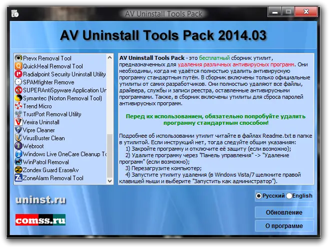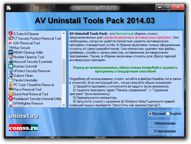 AV Uninstall Tools Pack — это бесплатный набор утилит для полноценного удаления антивирусных и антишпионских программ. Он предназначен для тех случаев, когда стандартные средства деинсталляции оказываются недостаточно эффективными или вызывают ошибки. В состав пакета входят утилиты, полностью удаляющие файлы, драйверы, службы и записи реестра, оставленные различными антивирусами.