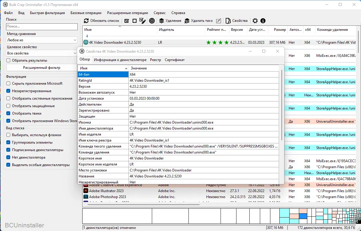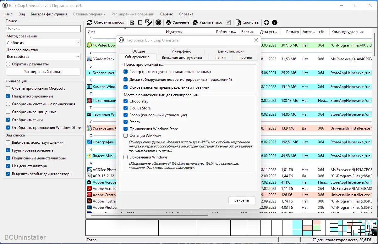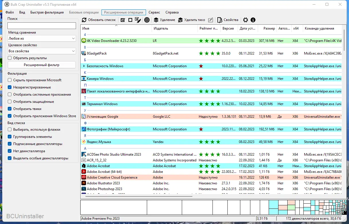 Bulk Crap Uninstaller (BCUninstaller) — это расширенный деинсталлятор, предназначенный для удаления любых программ с ПК без следов и остатков. В отличие от встроенных средств Windows, данная программа осуществляет глубокую очистку реестра, удаляет созданные папки и файлы, что обеспечивает более чистую систему после удаления. Внешний интерфейс прост и понятен, весь функционал сводится к выделению нужных приложений и выбору действия, что делает программу доступной для пользователей с разным уровнем опыта. Для продвинутых пользователей предлагаются дополнительные функции для более тонкого управления процессом удаления.