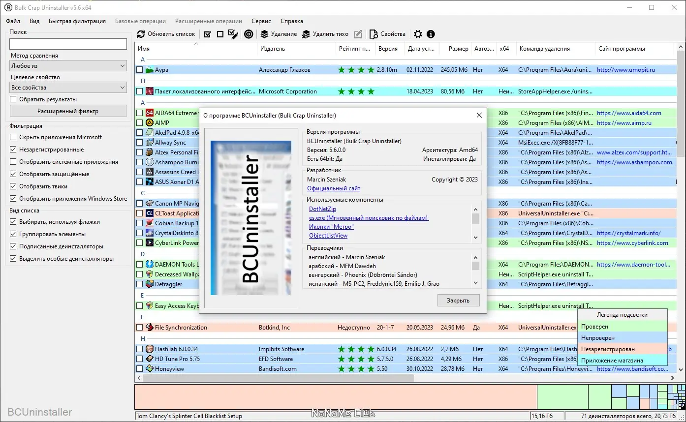 Bulk Crap Uninstaller (BCUninstaller) — это деинсталлятор программ, который позволяет удалять любые приложения на вашем ПК без следов и остатков. После установки и запуска программа систематически собирает список установленных приложений, предоставляя возможность выбрать нужные для удаления. Программа обладает интуитивно понятным интерфейсом, подходит как новичкам, так и опытным пользователям, благодаря наличию расширенных функций для продвинутых сценариев работы. Она работает с учетом особенностей системы, предлагает дополнительные опции, такие как создание точки восстановления перед удалением, фильтры отображения программ и менеджер автозапуска. Использование BCUninstaller помогает ускорить работу системы, освобождая место на диске за счет устранения мусорных файлов и остатков удаляемых программ.