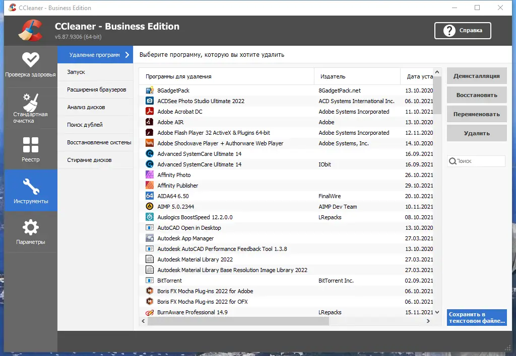 Комплексное решение для очистки и оптимизации системы. Эта программа помогает легко избавляться от временных файлов, следов интернет-серфинга и ненужных данных, повышая производительность вашего ПК и освобождая место на диске.