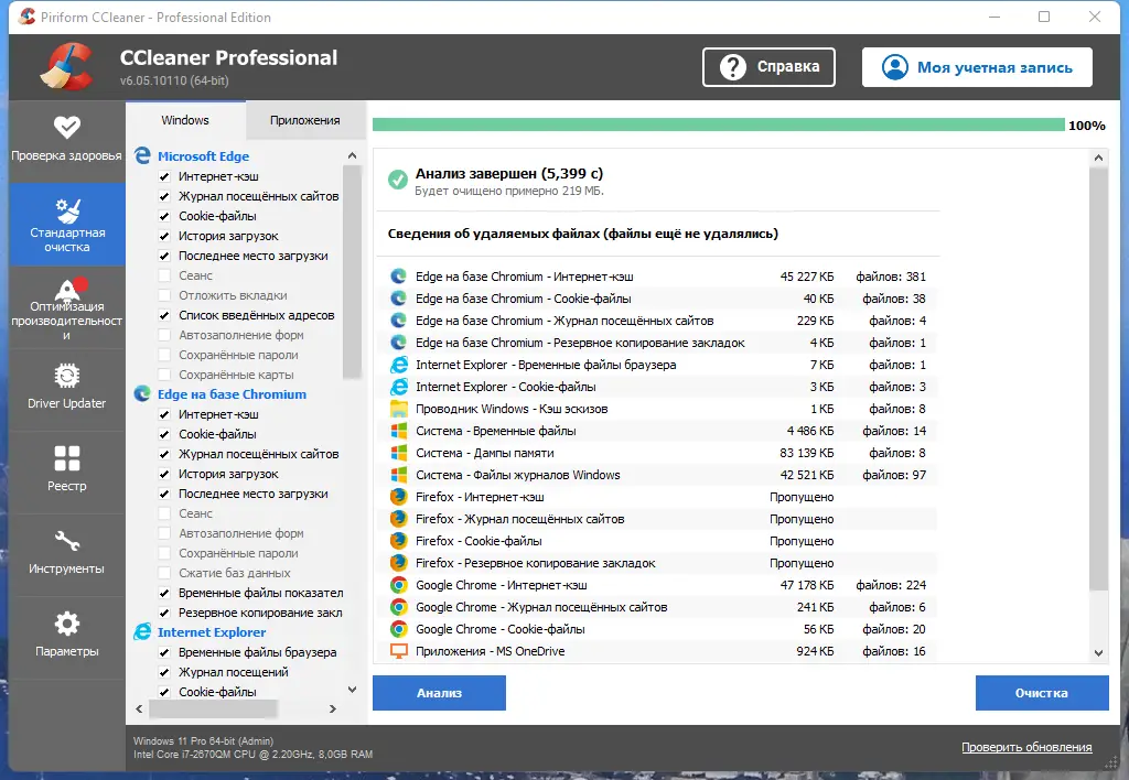Выполняя комплексные операции, CCleaner повышает производительность системы, освобождает память и предотвращает возможные сбои, связанные с накоплением ненужных данных. Кроме того, программа включает дополнительные инструменты, такие как Driver Updater и Оптимизатор производительности, которые помогают поддерживать систему в максимально эффективном состоянии.