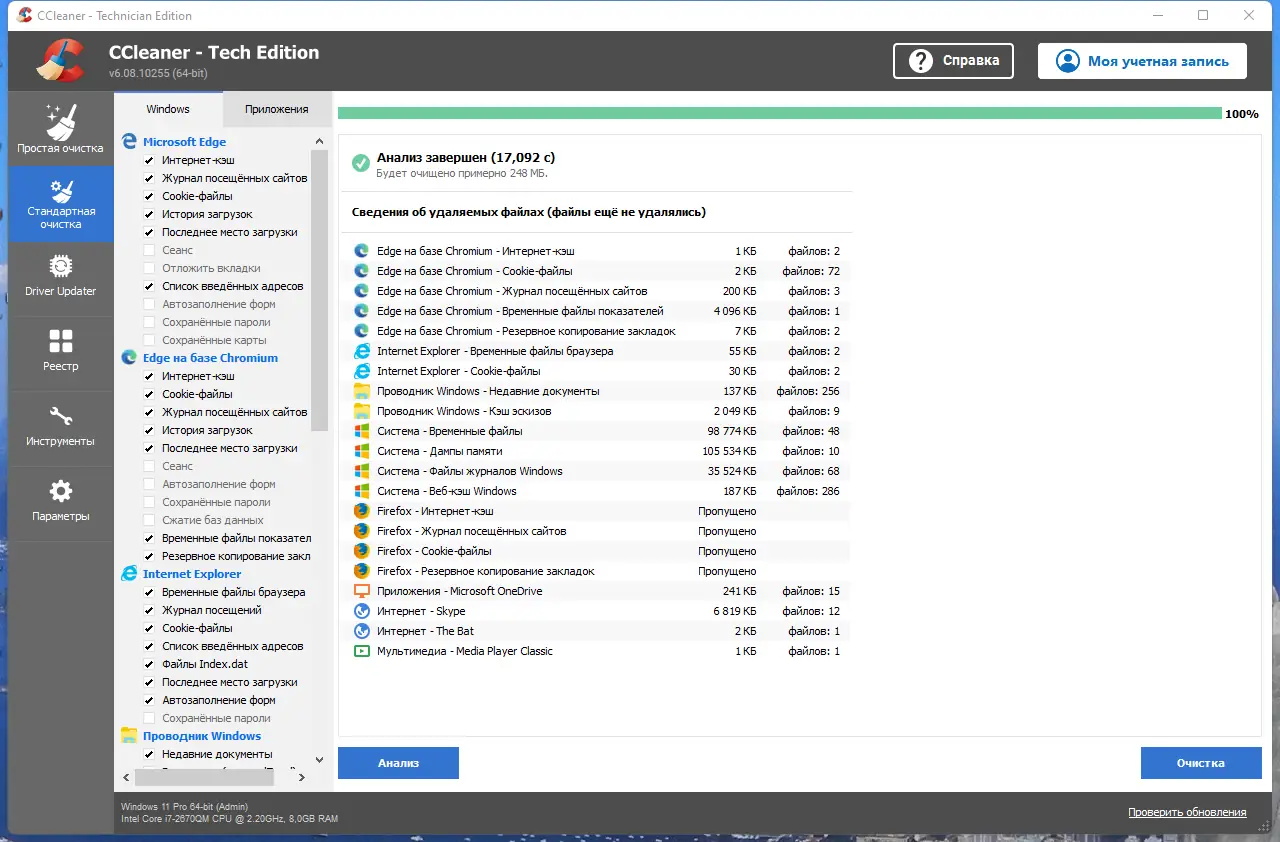 - Удаление временных файлов, журналов Windows, дампов памяти и устаревших данных Prefetch.