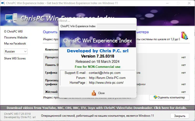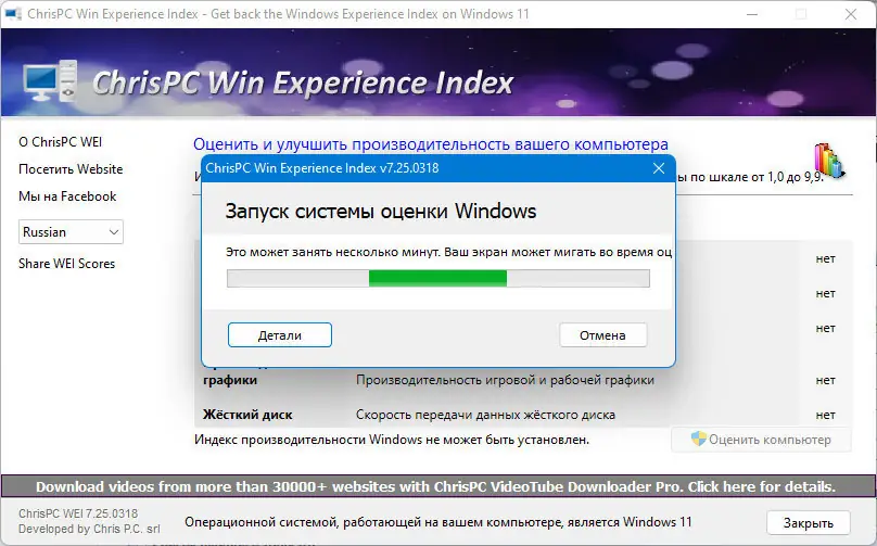 ChrisPC Win Experience Index — бесплатная утилита, которая позволяет самостоятельно измерить системный индекс производительности в Windows, расширяя функции стандартных средств оценки. Программа обладает простым и интуитивно понятным интерфейсом и быстро устанавливается без необходимости дополнительных настроек.