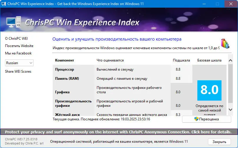 Данная утилита предназначена для определения общего уровня производительности вашего компьютера, анализируя работу ключевых компонентов системы — процессора, оперативной памяти, видеокарты и жесткого диска. После запуска пользователь сразу же получает результаты в виде оценки по шкале от 1.0 до 9.9, где общий индекс определяется по самому низкому значению среди отдельных параметров. В отличие от встроенных инструментов Windows, эта программа значительно расширяет возможности оценки, позволяя легко оценить параметры для различных версий ОС, включая Windows 7, 8/8.1, 10 и 11.
