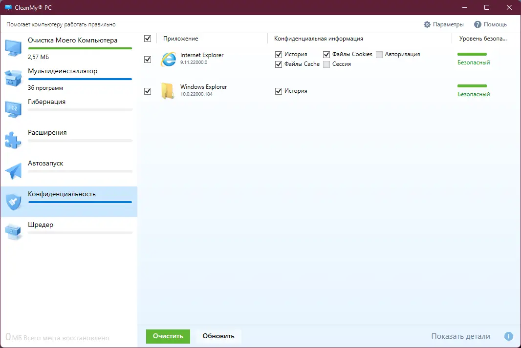 CleanMyPC — это многофункциональный инструмент для быстрого и безопасного обслуживания вашего компьютера. Он удаляет системный мусор, остатки удалённых приложений, очищает реестр, управляет автозапуском и расширениями браузеров, а также предоставляет возможность полностью скрытно удалить файлы и программы. Особое внимание в разработке уделено интуитивно понятному и эстетичному интерфейсу, что делает работу с программой комфортной и приятной. В составе есть функции для управления режимом гибернации, очистки личных данных и защиты конфиденциальности.