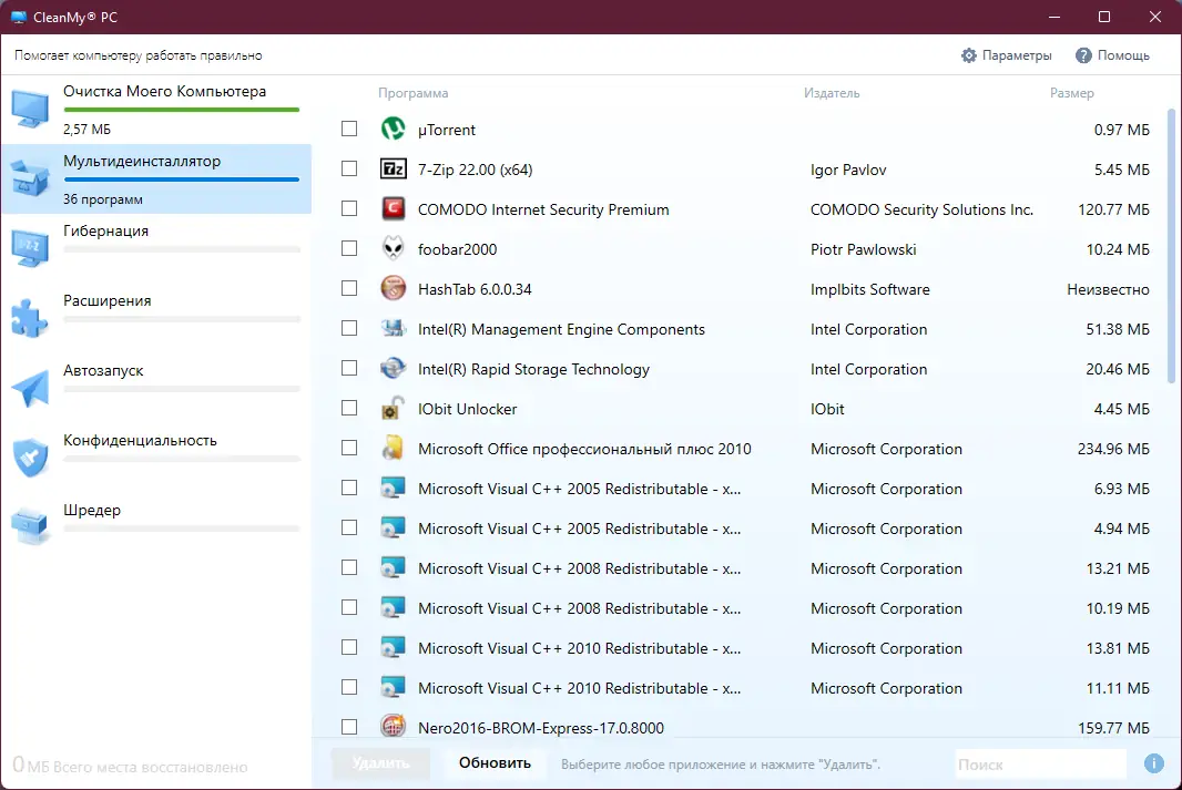 - Бесследное удаление программ и их остатков, включая файлы и записи в реестре.
