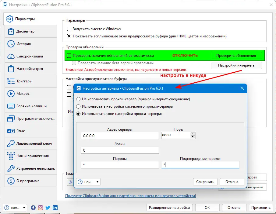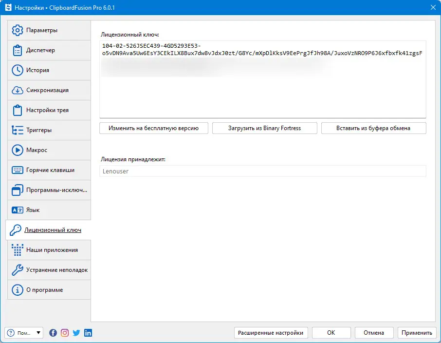 - Для избежания блокировки доступа в интернет заблокируйте исполняемый файл ClipboardFusion.exe в файерволе или пропишите исключение в файле hosts, добавив строку 127.0.0.1 api.binaryfortress.com
