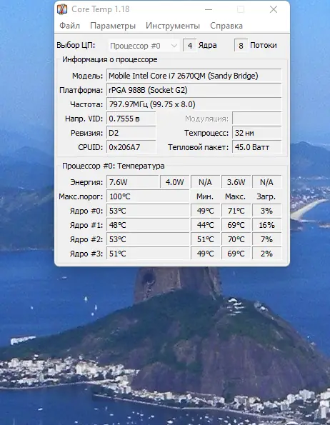 Core Temp — бесплатная программа для мониторинга температуры процессора в режиме реального времени. Она поддерживает различные семейства CPU и отображает показатели каждого ядра отдельно, что позволяет следить за их состоянием и предотвращать перегрев.