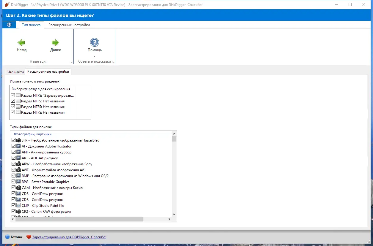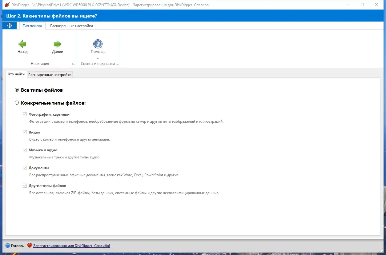 - Сканирование всего диска на наличие следов различных типов файлов.