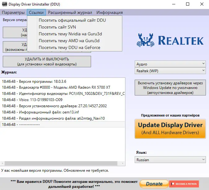 Основной интерфейс прост и удобен: все функции сосредоточены в одном окне, что позволяет быстро осуществлять необходимые действия. В программе реализована поддержка русского языка и возможность сохранять журналы для анализа процесса удаления. Также предусмотрена интеграция с Windows Update для установки драйверов, а автоматические проверки обновлений делают работу с утилитой максимально комфортной и безопасной.
