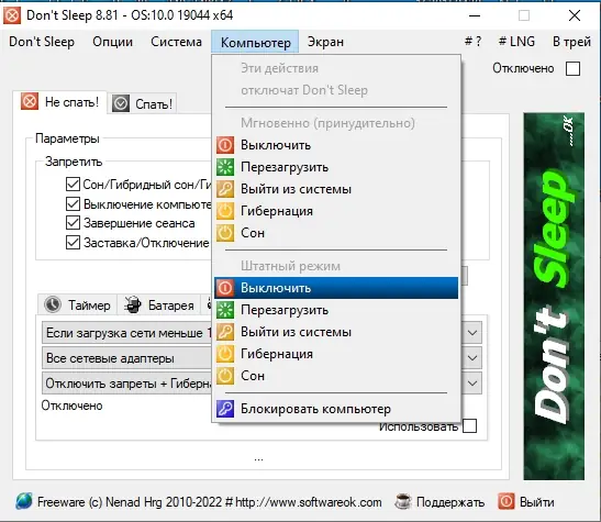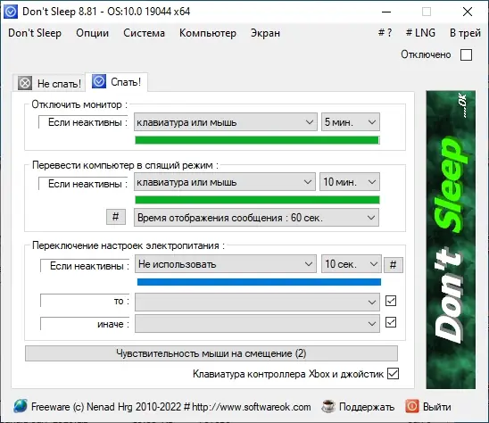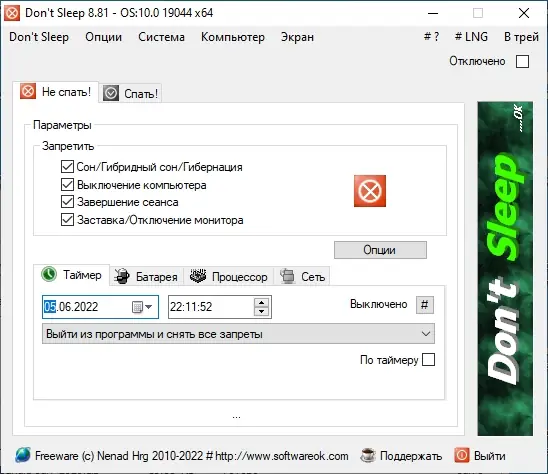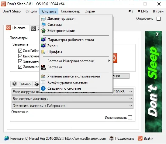 Dont Sleep — это бесплатная утилита, предназначенная для временного отключения настроек электропитания в операционной системе Windows. Благодаря простому интерфейсу пользователь может выбрать, какие функции отключать, а также установить таймер, после которого компьютер автоматически выполнит заданное действие, будь то выключение, блокировка или перевод в спящий режим. Программа не требует установки, работает в портативной версии и поддерживает как 32-, так и 64-битные системы, что делает её удобным инструментом для системных администраторов и обычных пользователей.