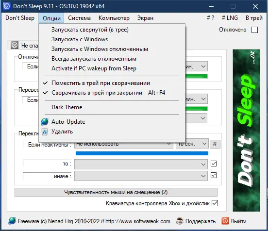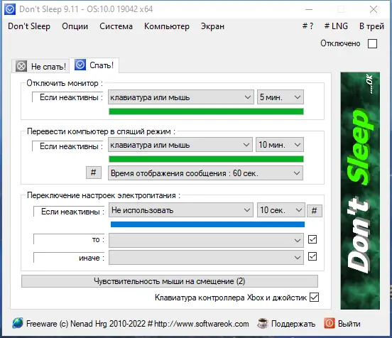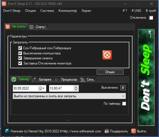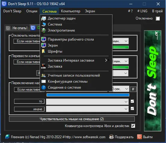 Dont Sleep — утилита, которая временно отключает настройки электропитания, такие как блокировка рабочего стола, режим гибернации и хранитель экрана. Это позволяет пользователю продолжать работу без автоматических блокировок и отключений, а также управлять временем без ограничений. Программа также обеспечивает возможность отслеживать и настраивать временные интервалы, после которых компьютер выполнит автоматическое выключение, блокировку или перевод в спящий режим.
