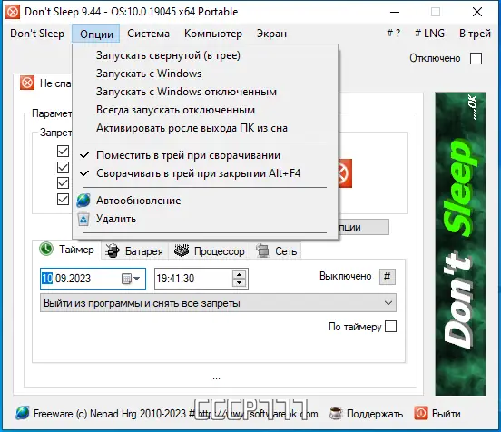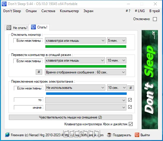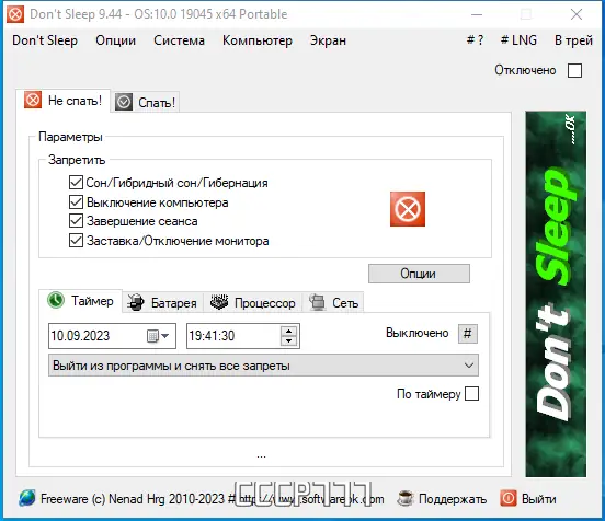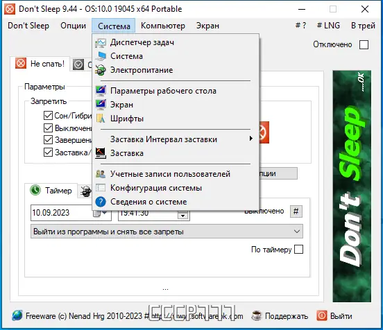 Используя программу под названием «Don’t Sleep», пользователи получают удобный инструмент для временного отключения настроек электропитания на компьютере. Эта утилита позволяет выбрать конкретные параметры, такие как хранитель экрана, режим гибернации и блокировка рабочего стола, чтобы обеспечить непрерывную работу без автоматического выключения или блокировки системы. Кроме того, она содержит встроенный таймер, который отсчитывает заданное время, после которого автоматически выполнит действия: выключит, заблокирует или переведет устройство в спящий режим. Таким образом, вы сможете точно управлять режимами питания и автоматическими событиями вашего ПК, сохранять время и повышать эффективность работы.