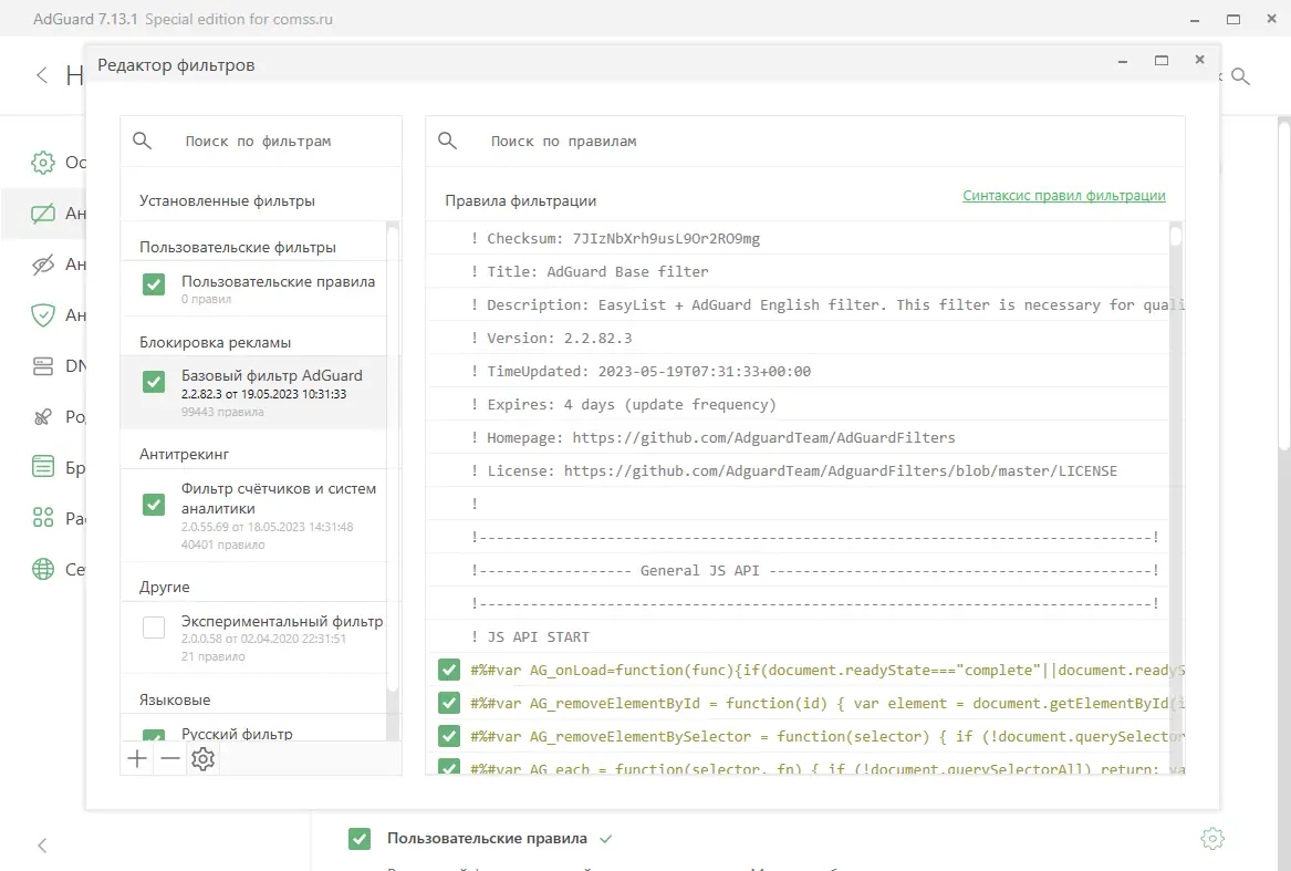 Adguard представляет собой мощный интернет-фильтр для защиты пользователей от опасных веб-сайтов, вредоносных ресурсов, мошеннических схем и фишинговых атак. Благодаря ежедневному обновлению баз данных с помощью крупнейших ресурсов, таких как Google Safe Browsing, списки Web of Trust и Malwaredomains, программа надежно блокирует все виды угроз и рекламных элементов. Веб-защита интегрирована со всеми популярными браузерами, что обеспечивает безопасность и комфорт при серфинге. В дополнение к защите, Adguard предлагает родительский контроль для проверки сайтов, на которые заходят дети, а также возможности ускорения работы и экономии трафика за счет блокировки рекламы и ненужных элементов. Количество постоянных пользователей программы превышает несколько миллионов, что подтверждает её эффективность и надежность.