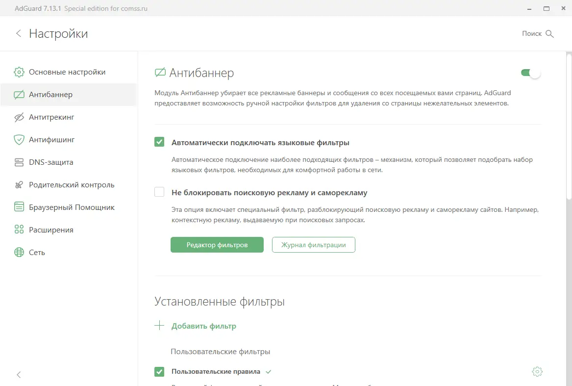 Уникальная программа для защиты интернета и повышения комфорта работы в сети, объединяющая фильтрацию рекламы, защиту от угроз и родительский контроль.